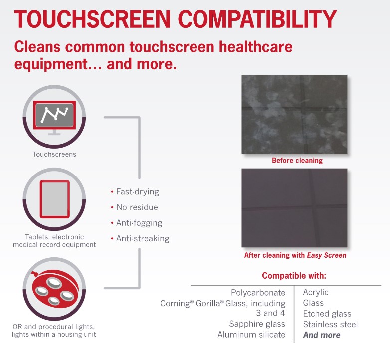 Finally a compatible touchscreen cleaner that features the power of 70% isopropyl alcohol to clean common touch screen healthcare equipment and more.